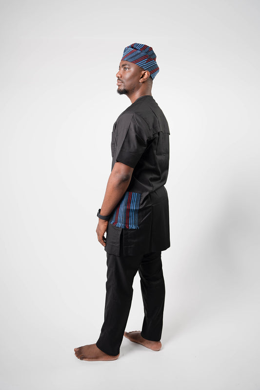 Black Kaftan with Aso Oke Pockets with Black Pants and Cap