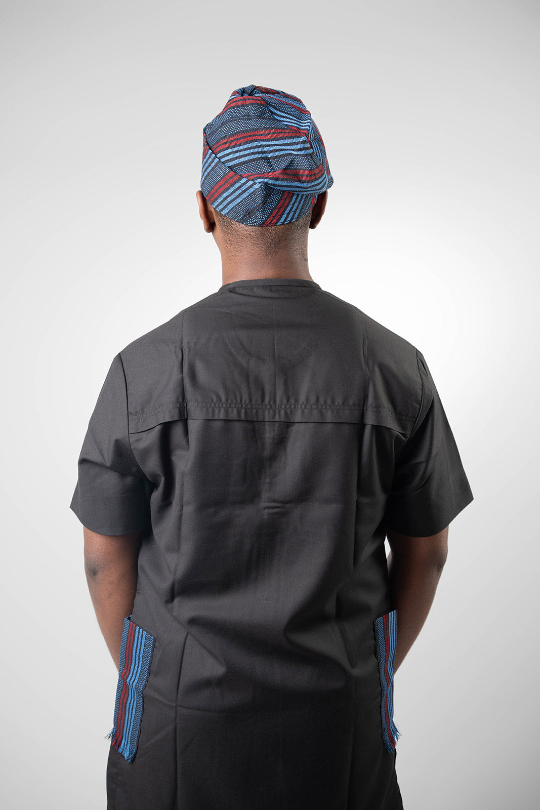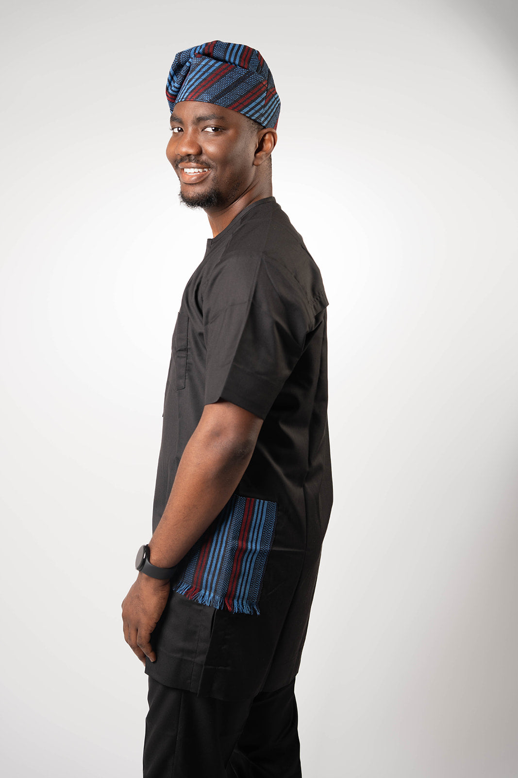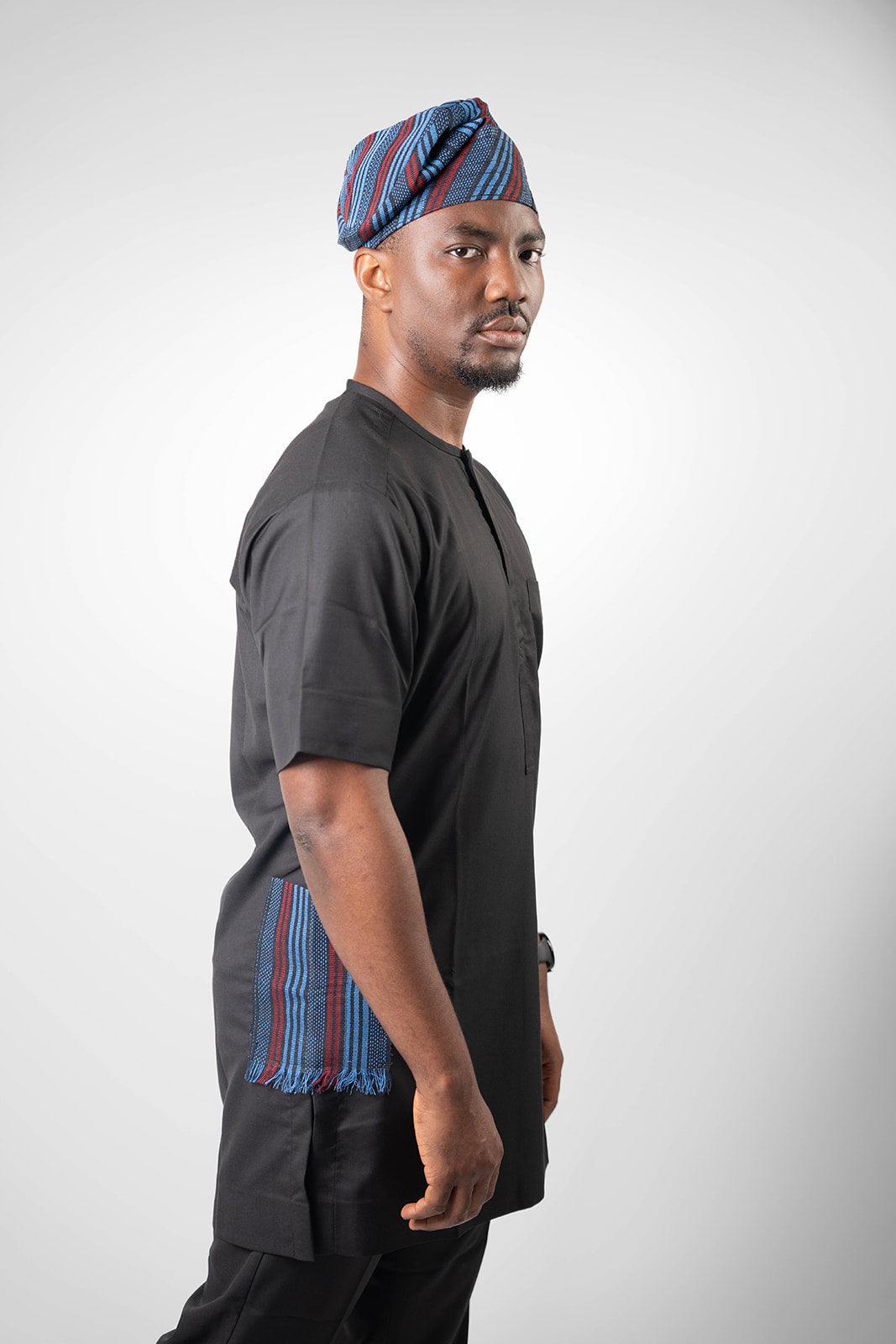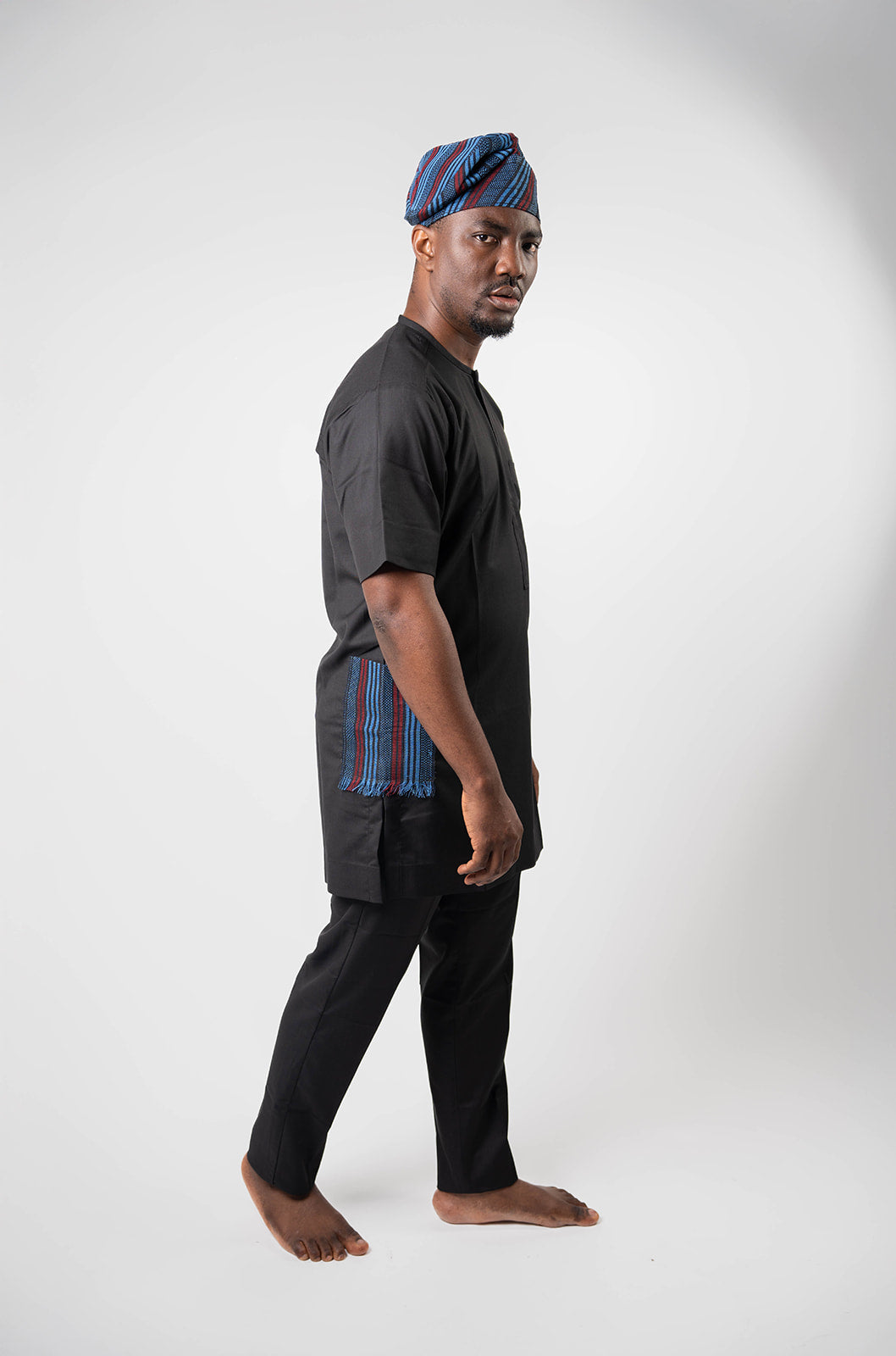 Black Kaftan with Aso Oke Pockets with Black Pants (without Cap)
